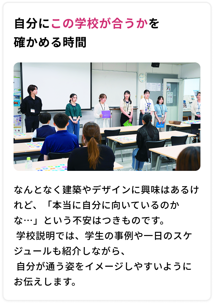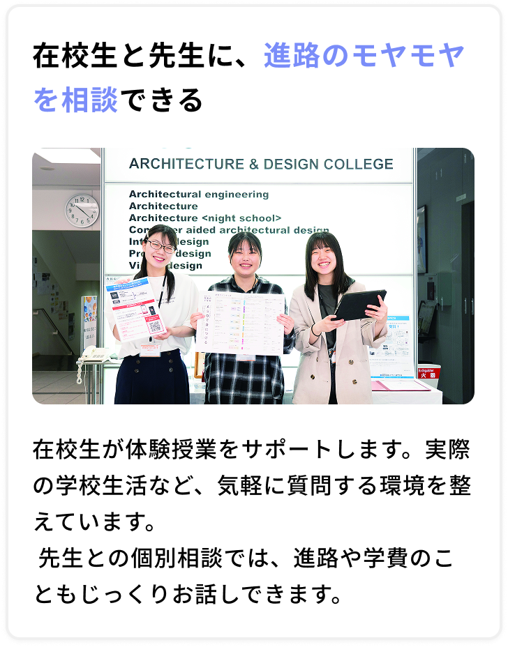 卒業制作展で「ちょっとおもしろいかも」と感じたら、次はオープンキャンパスで、建築・インテリア・デザインの“自分に合う道” を確かめてみませんか。 まだ分からなくていい。 だからこそ実際に見て、聞いて、体験してみる一日です。